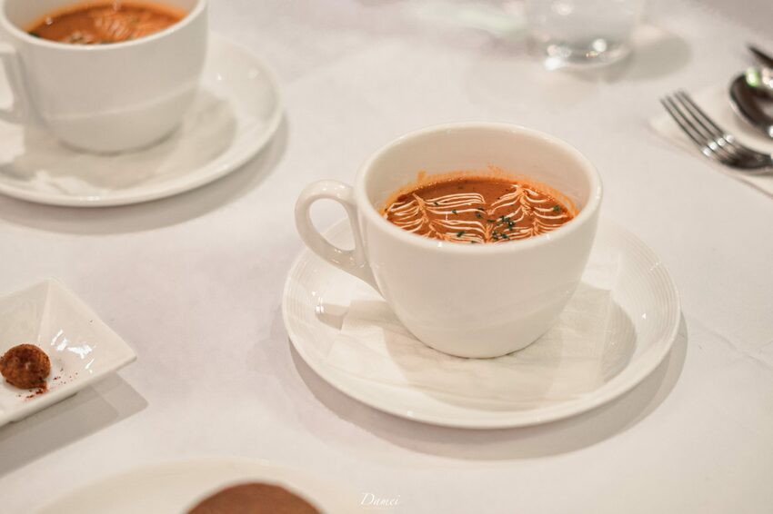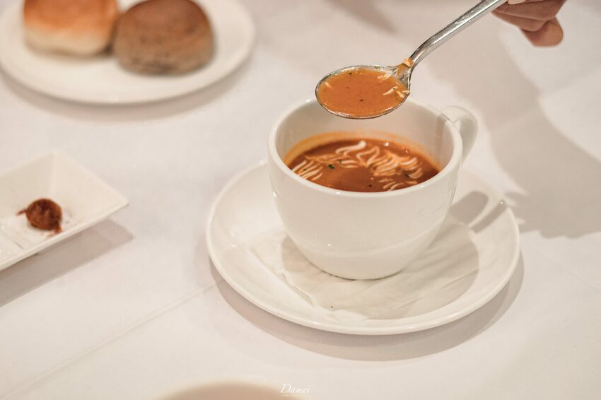 香頌私宅洋樓不僅在空間氛圍營造的好,對於料理本身的掌握度也很充分,這一份蕃茄濃湯,可是主廚選用兩種番茄(濃縮番茄、新鮮蕃茄)與大量洋蔥熬製而成,因為洋蔥的關係,讓整碗湯的甜度偏高,最後再加上羅勒葉提味,他是番茄湯,可是卻不簡單。