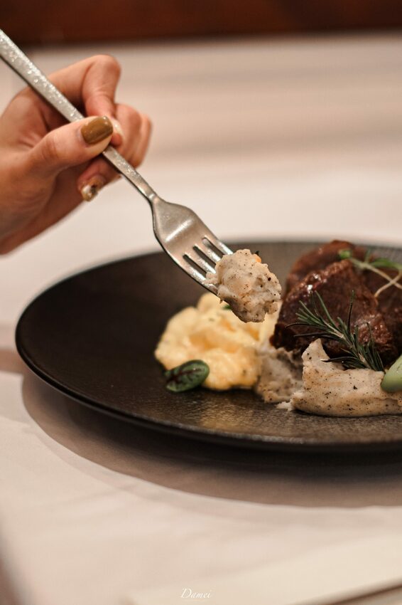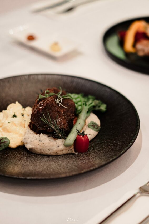 又是一次放朋友開吃,而我還在拍攝的時刻(笑)她這麼一說,我當然不能放過這松露洋芋泥了,綿密又清爽的洋芋泥,他並沒有一般洋芋泥的膩感,反而爽口,一旁的烤蔬菜也保留原本蔬菜的口感與香氣,光是配菜就已經加分,那麼牛肉呢?