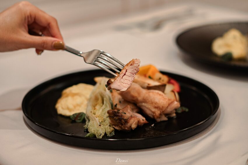 在這次午餐時段的新菜單中,共有四種不同的主食可選擇,首先上桌的是炙烤香草舒肥雞腿,先以迷迭香醃製,約低溫一小時的時間,為了不要讓口感變差,主廚在烹調時的手法也特別調整,只將雞腿煎上色後與煎雞腿表皮,最後再到烤箱烤,讓雞腿肉保有原本的軟嫩度以及能吃到表皮的脆感,當然迷迭香的香氣也是令人著迷呀。