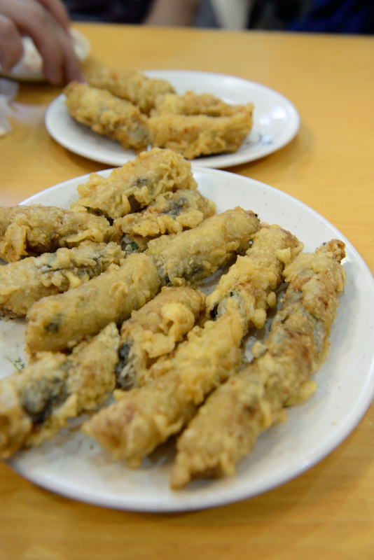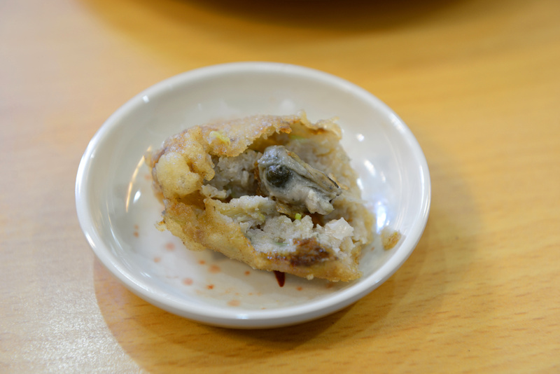 蚵捲外皮裹上炸衣,搭上內餡飽滿的蚵,一咬下,卡滋卡滋作響,