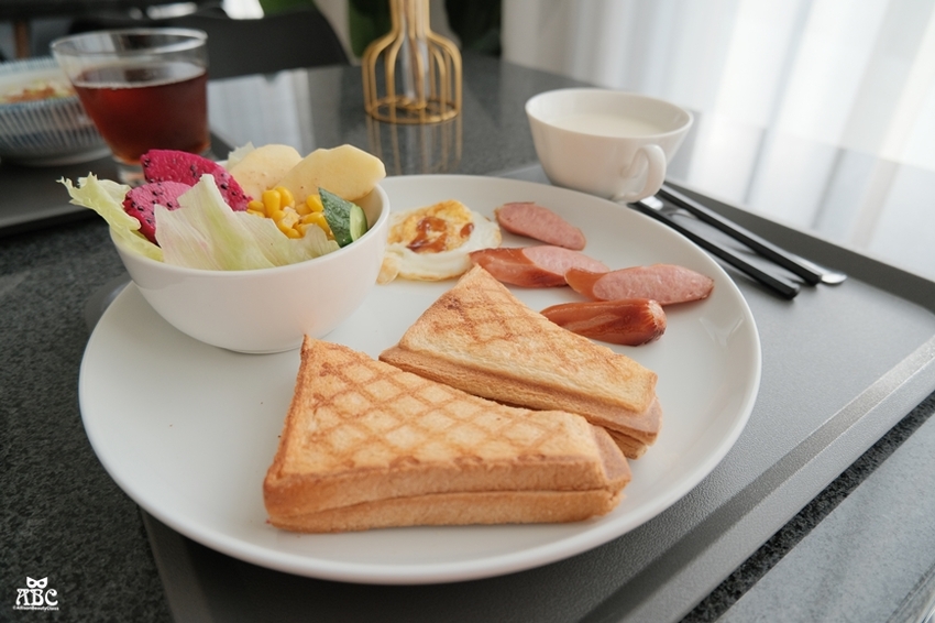 早餐有中式、西式兩種可以選擇,先來介紹西式的,水果沙拉、煎蛋、燻腸、磚壓吐司是紅豆口味喔!不會太甜很好吃,搭配無糖豆漿,我喜歡的輕食風格早餐。