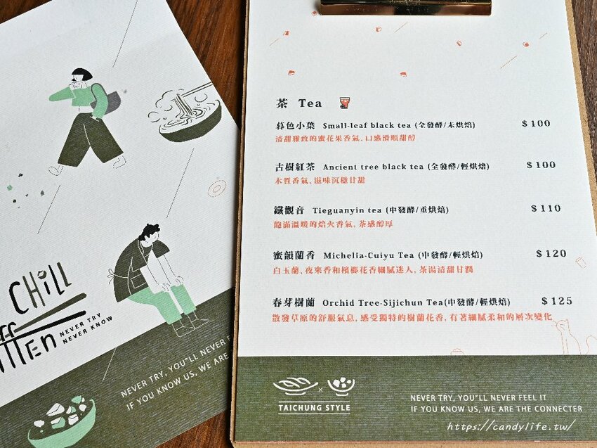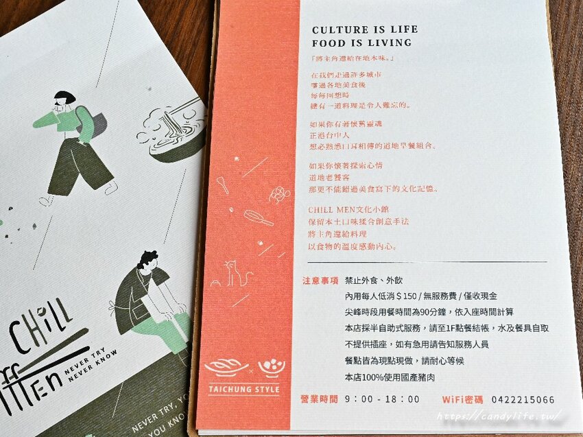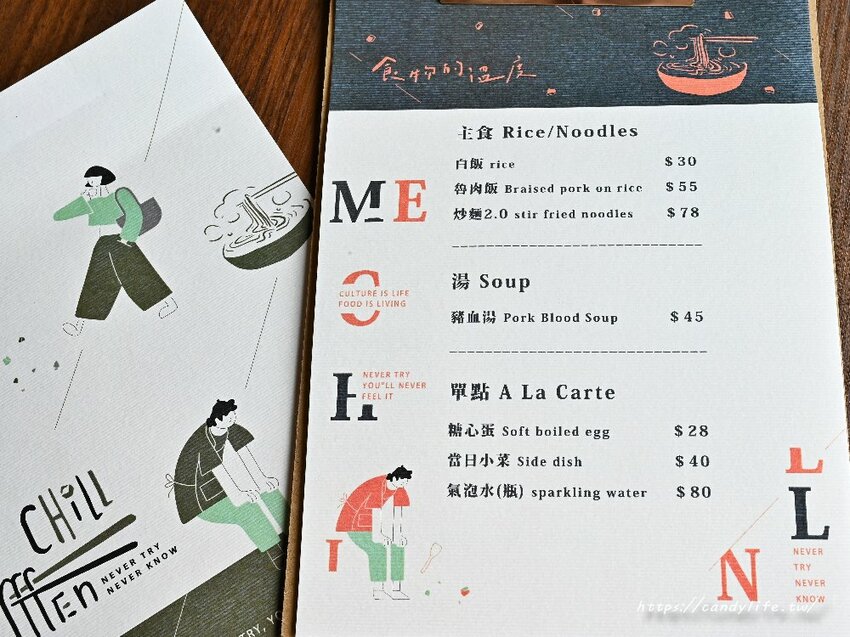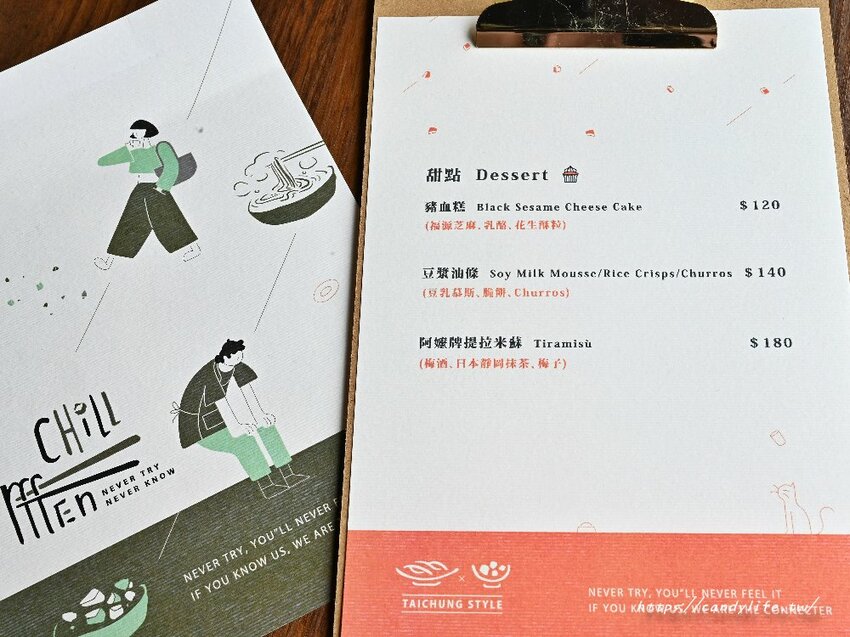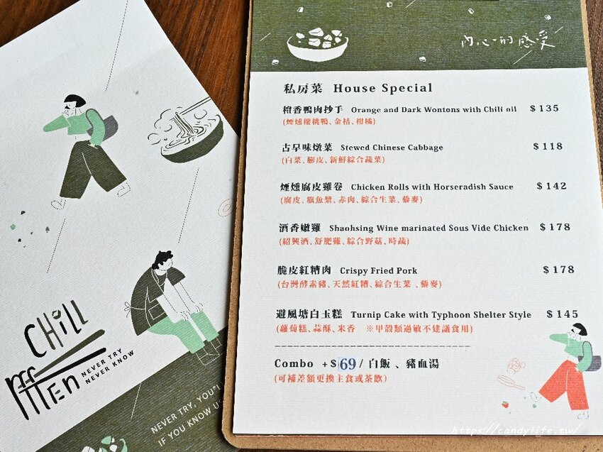 Chill men內用每人低消150元,只收現金,沒有收服務費,餐點以中式料理為主,除了常見的台灣小吃,還有主廚的私房菜及創意甜點