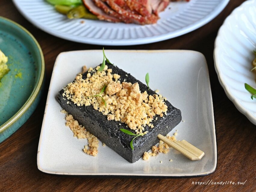 外表看起來像豬血糕,其實這是道甜點,採用法國白乳酪,搭配新竹福源芝麻醬及酥脆的鹽之花酥粒,歐罵罵的芝麻乳酪,口感綿密紮實,香氣濃郁,甜而不膩,深受長輩們的喜愛呢