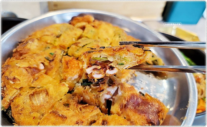 海鮮泡菜厚煎餅,看著煎餅的外表就是很酥香的誘人樣子,而且海鮮也感覺不少呢