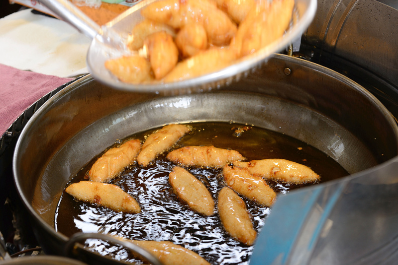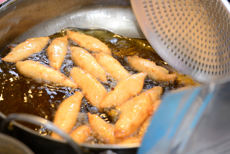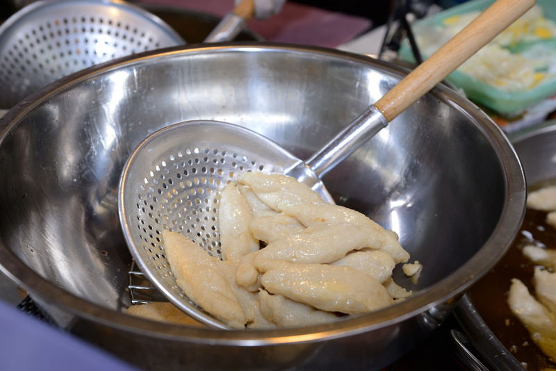 店家把金黃色的旗魚黑輪快速撈起,趕緊倒在濾油盤上,