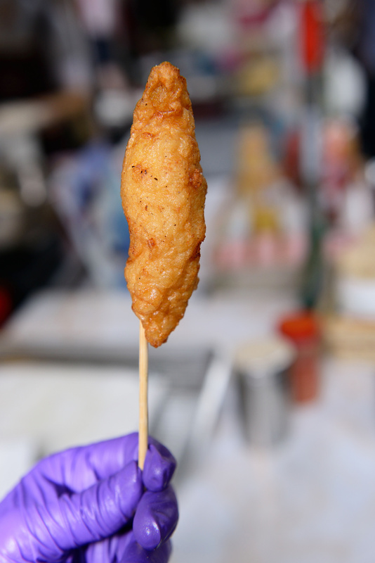 另一方面,店家把剛剛稍微炸過的旗魚黑輪,馬上放入高油溫油炸,