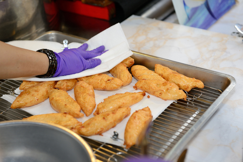 衛生方面也很注重,全程戴手套作業,等滑入油鍋的黑輪定型,