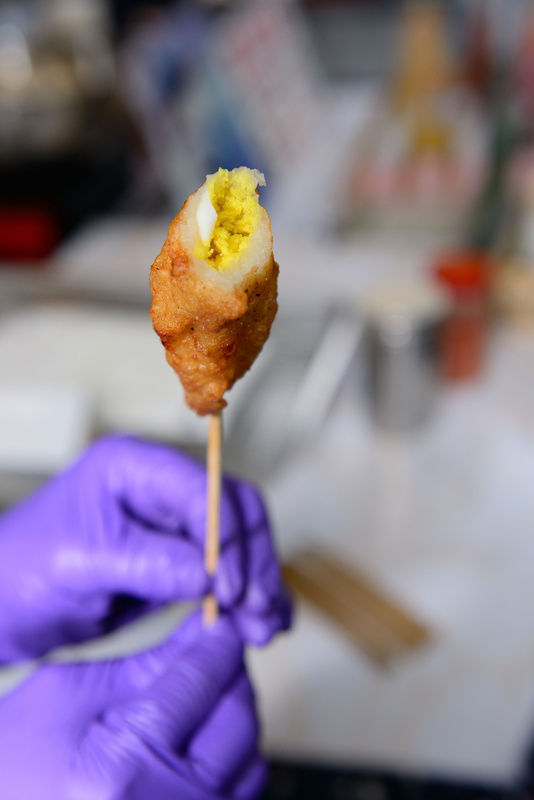 放入水煮蛋,用小刀左右撇過,馬上滑入低溫油鍋裡,