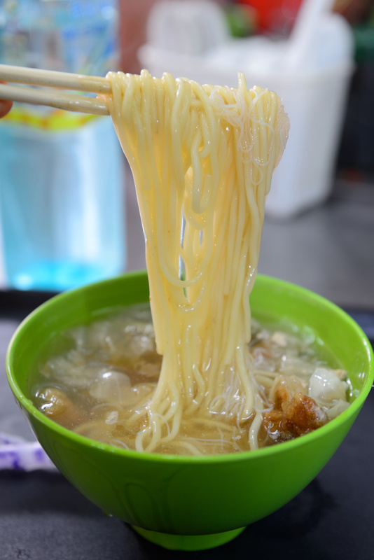 把麵與米粉用擔子下去用水煮,一會兒撈起再加入赤肉與羹湯,