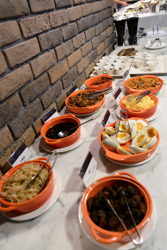 中式早餐提供鹹蛋、肉鬆、麵筋、秋刀魚、瓜類...等,