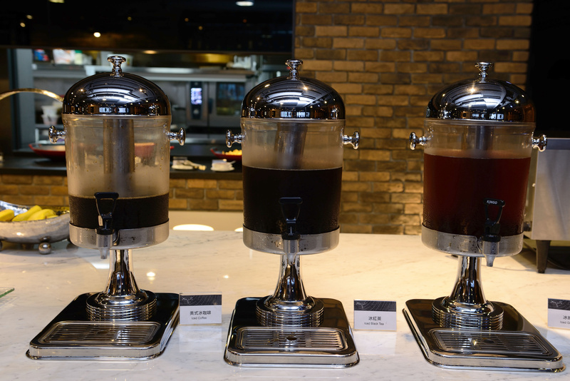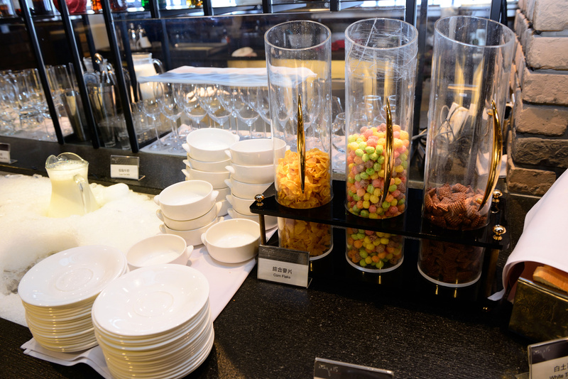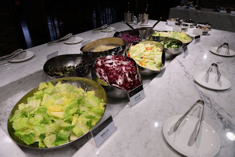 餐廳buffet,分為沙拉、中西式早餐、飲品、麵包...等區域,