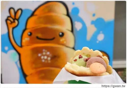 內餡是抹茶口味的的麵包捲,像可頌千層感一樣,外面脆脆帶有顆粒,內餡還有奶油當驚喜包!可以吃的到抹茶的香感,但一樣不會死甜~