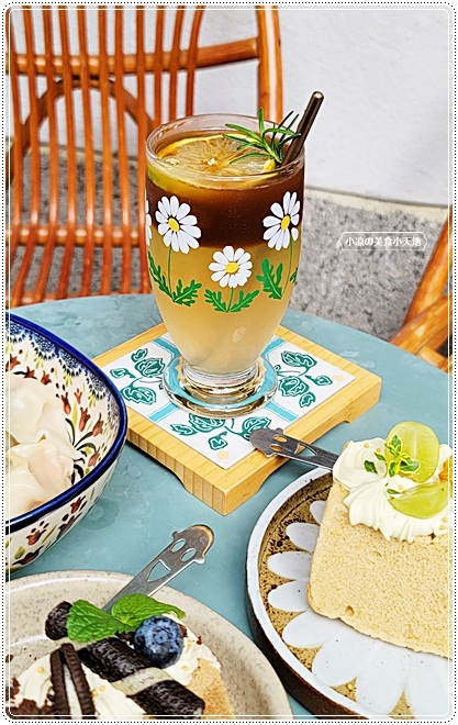 今日甜點的品項都會掛在自助取水杯上頭,每日提供的甜品會有不同,小涼今日選了紅茶可可戚風蛋糕。