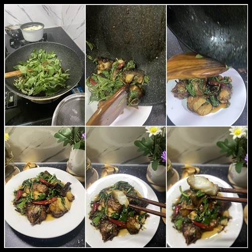 再加入醬油、米酒翻炒 ,最後加入九層塔