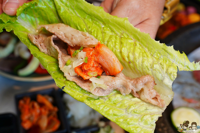 可以用生菜包肉,搭一點韓式泡菜、創意風味自己來