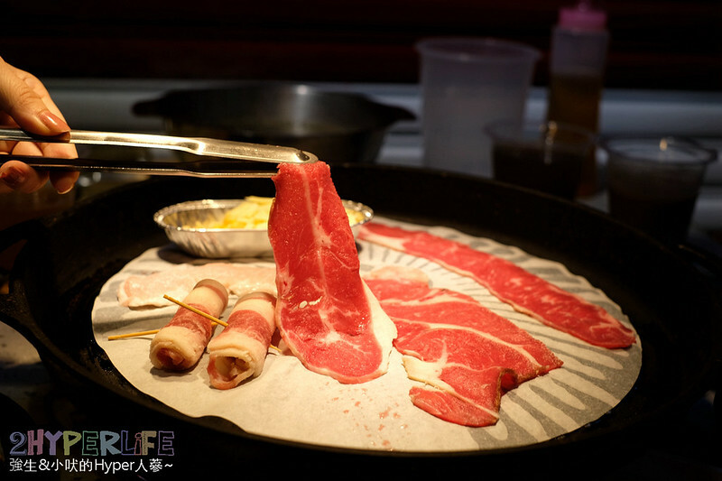 基本上桌面看到的肉品,我們就用迅雷不及掩耳的速度,直接架上烤爐內。咚豬咚豬的烤肉爐上面有鋪一張烤肉紙,油不僅瞬間吸起來,而且爐子還稍微傾斜,讓多餘的油脂可以順勢沿著鍋子滴出去