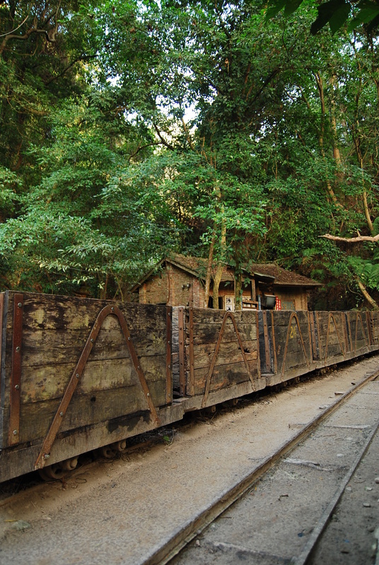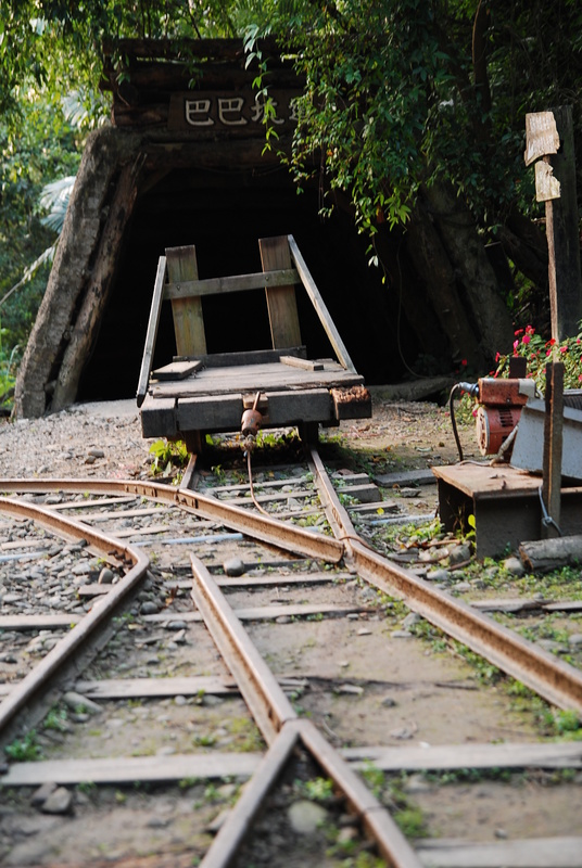 順著鐵道走,鐵軌的光澤隨著時間產生鏽積,堆載坑道的拖籠,