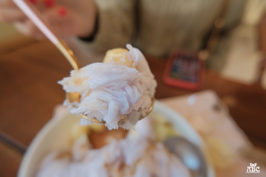 一入園我就看到外面招牌上期間限定的哈密瓜冰品,剛好去的這天天氣很好,很適合吃冰。薰衣草口味的雪花冰,搭配滿滿哈密瓜,還有附上濃縮咖啡、煉乳兩種淋醬。