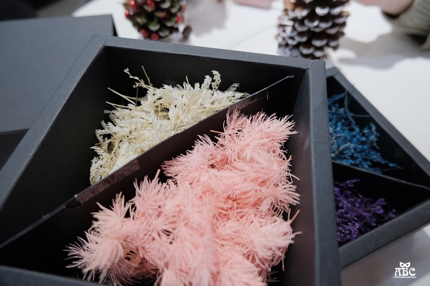 DIY時間約一小時,大家可以斟酌一下,我們是選擇中午時段剛好在這邊避開陽光最強烈的時候,等做完出去拍照剛好適合。這個聖誕樹DIY過程很簡單,平常沒有玩手作也沒關係,就是挑選一棵喜歡的松果,然後用現場提供的素材,裝飾成自己喜歡的樣子,工具的部分使用的是熱熔膠槍,要注意前端會燙喔!