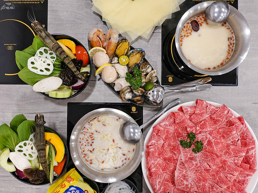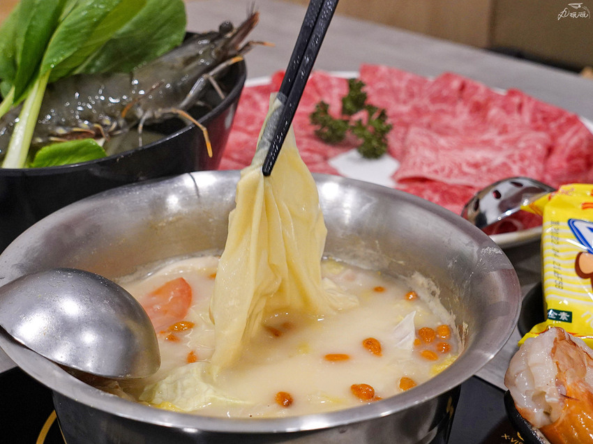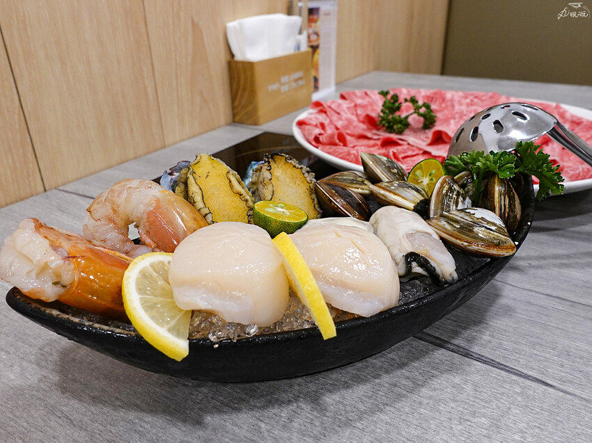 我們選了冠軍和牛海陸雙人套餐,各選了喜歡的湯底,以及蔬菜盤和附餐,主餐餐點內容有澳洲米其林冠軍和牛霜降16盎司、綜合時令海鮮再贈黃金豆腐紙。