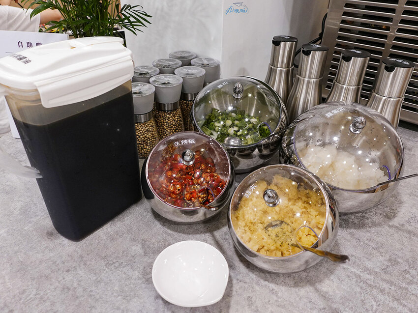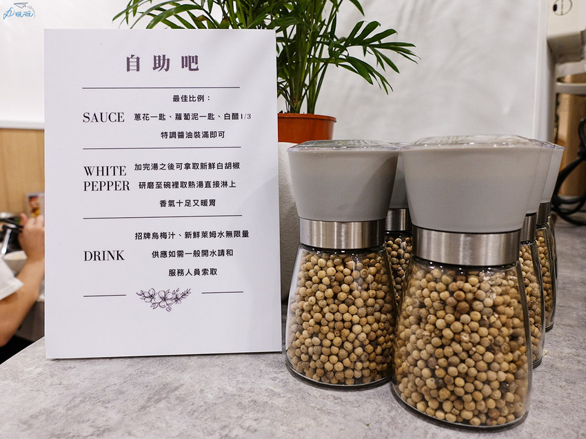 自助吧旁的小牌子上,有店家醬料最佳比例推薦。除此之外,一旁還有白胡椒大軍等候出征,建議品嚐的方式是,將白胡椒粉研磨至碗裡,再淋上熱湯享用,絕對暖胃。