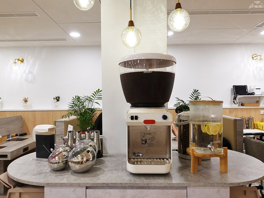 中央設計為醬料飲品自助區,供客人自行斟酌用量無限取用。