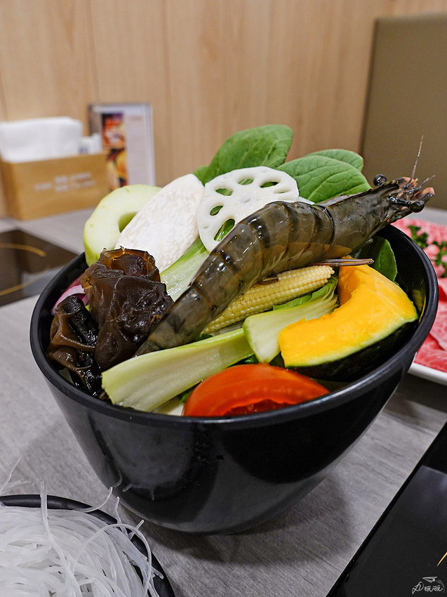 蔬菜盤的內容物有:高麗菜、青江菜、紫洋蔥、南瓜、番茄、玉米筍、杏鮑菇、蓮藕、大黃瓜、木耳,最後還有一隻大海老蝦。