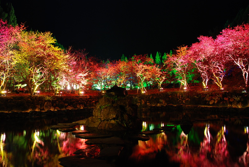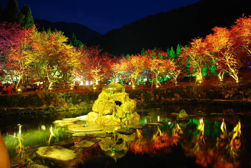 夜櫻燈光映射水中的倒影,好美喔~音樂不斷重新播放,當下就欣賞好幾回.