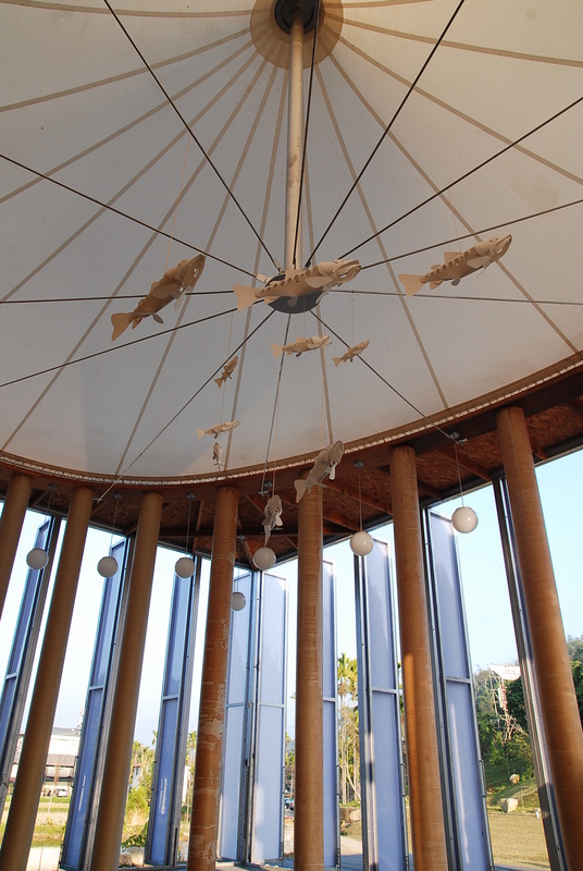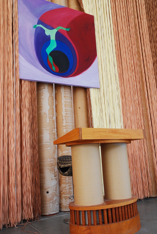 窗戶與紙柱子的部分佔了大半數,紙教堂的地下室有關於青蛙的展示,