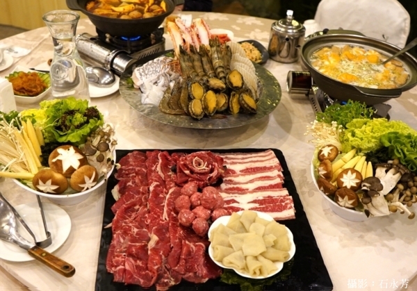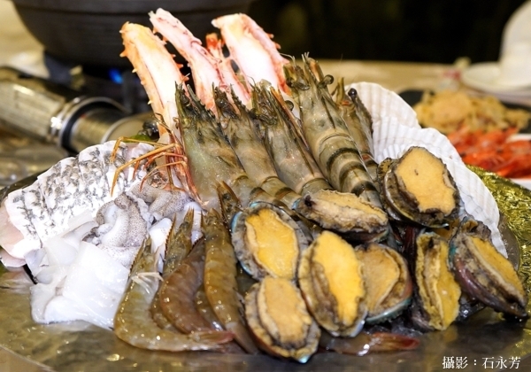在來自澎湖的甜不辣、花枝漿,手工製蛋餃、福袋加持下,還沒加入海鮮,就已是滿口的鮮甜味,待豬肉盤和海鮮盤上桌後,又是一陣騷動,這食材實在太過癮了,鱈蟹腿、半個拳頭大的牛奶生蠔、巴掌大扇貝、魚片、章魚片、鮑魚、明蝦、虎斑大草蝦…,這一盤都是高檔次貨色,物超所值。