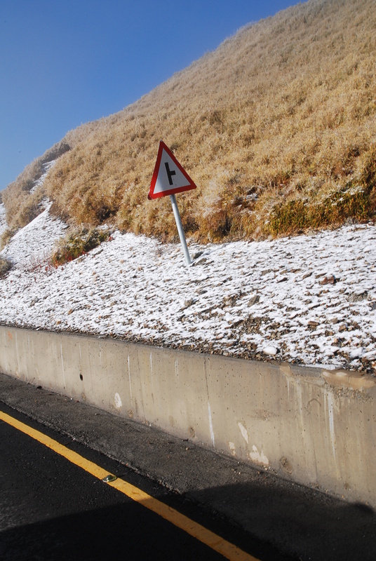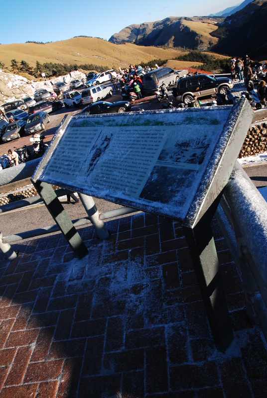 走上武嶺的觀景台,階梯上佈滿了雪,從上面下來的人動作遲緩也摸不著頭緒,