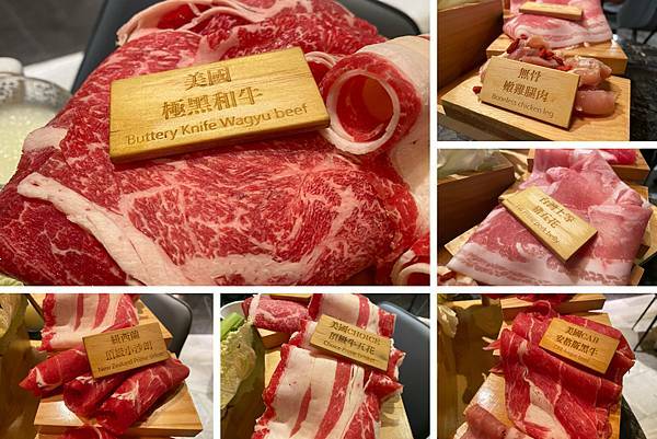 右邊的肉盤組合六種超人氣肉品,+68元升級的美國極黑和牛