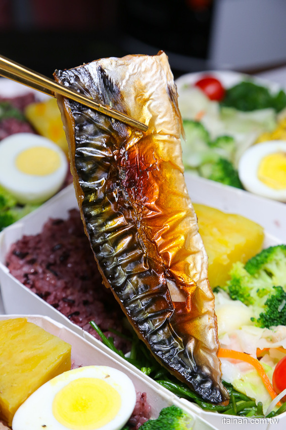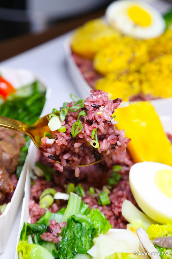 每個餐盒除了主食外,會有三樣青菜、半顆水煮蛋、地瓜、小番茄,青菜每日更換不定菜色,搭配的米飯則是更健康的黑米飯。