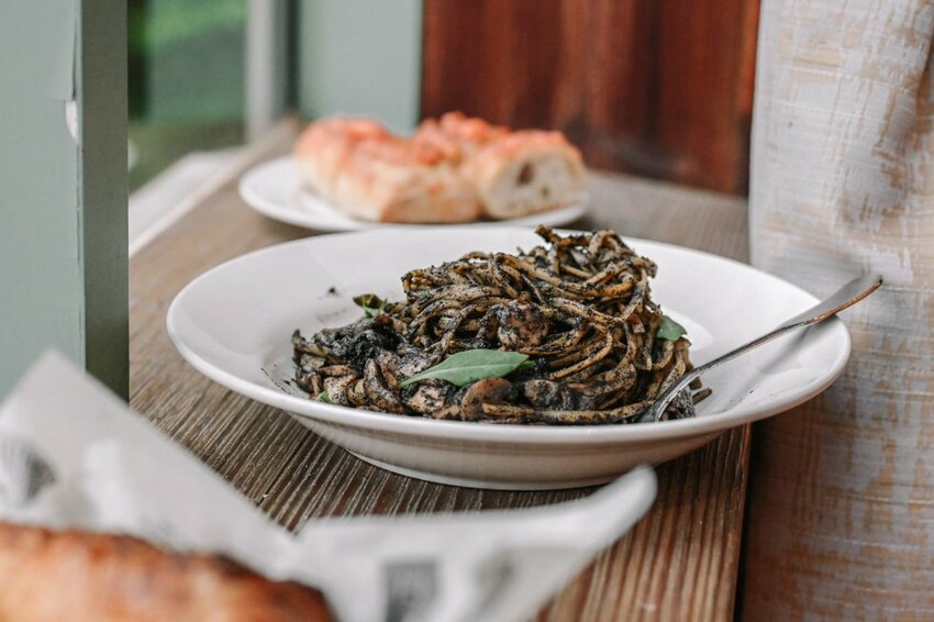 使用義大利扁麵條,每一根都完美包覆住主廚特調濃郁芝麻醬汁,還有加入杏鮑菇拌炒更有料。