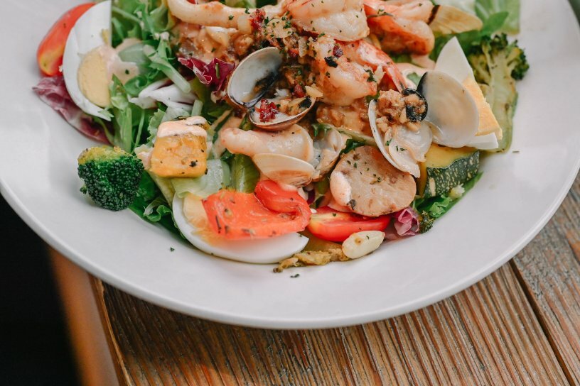 一送上來就被這份量嚇到,也太大盤了吧,二個人一起吃都很可以!內有鮮蝦、花枝、蛤蜊、黑橄欖、綜合生菜、南瓜、花椰菜、小番茄、水煮蛋、玉米筍等,加入鄉村優格醬提味,最愛熱沙拉繽紛的色彩,如迎接每一時刻的美好。