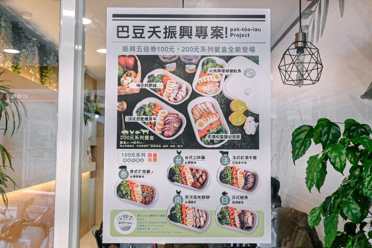 「低gi.com精緻低卡餐盒」有兩間分店,一間在台北民生店,一間在新北板橋店,低GI.com 精緻低卡餐盒民生店因應振興五倍卷方案,推出『巴豆夭振興專案』販售100元與200元系列餐盒,現場使用現金也很OK,現在買相當優惠呢。
