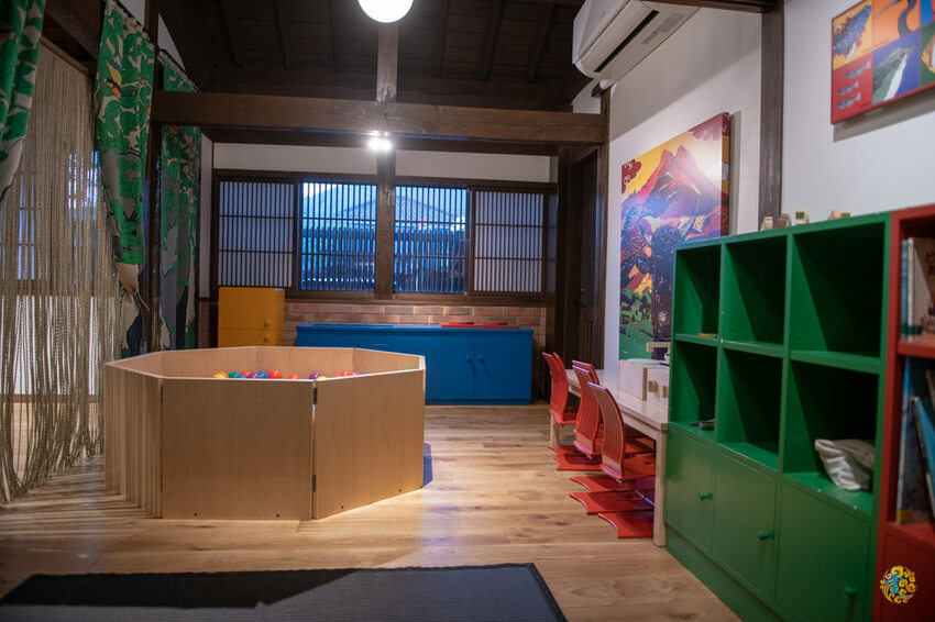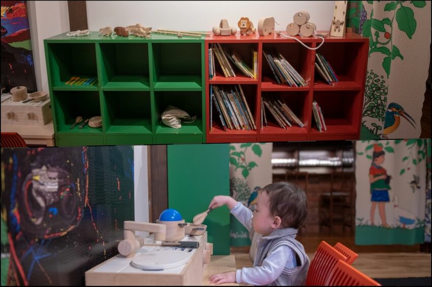 一進餐廳大門,狹長走廊的盡頭有一個武士盔甲。右邊前段是獨立的和室用餐區,右邊後段是包含兒童遊樂室的兒童餐聽,可以讓帶著小孩的家長們安心用餐的空間,也就是我們今晚用餐的地方,應該是因為有小凌雲在,所以被安排在這裡用餐。左邊中間是餐廳吧台,左邊後面是一個大眾的用餐空間。