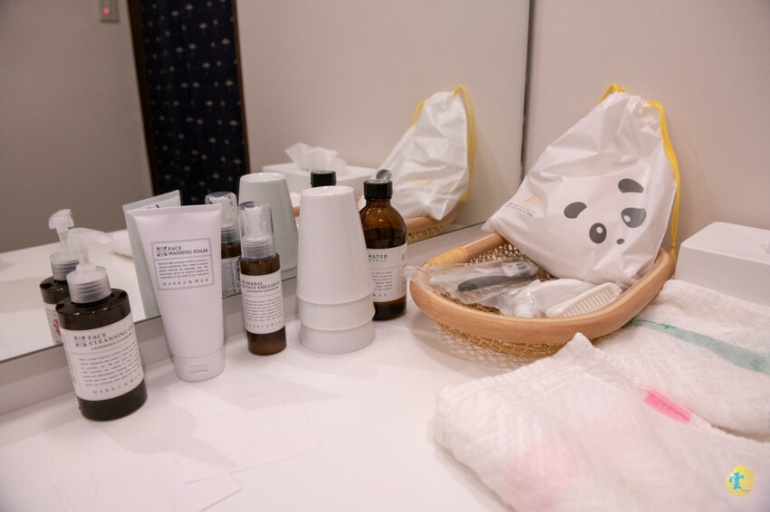 房間進門後,左邊是獨立小廁所,右邊是盥洗室跟浴室,相對應的備品一應俱全。