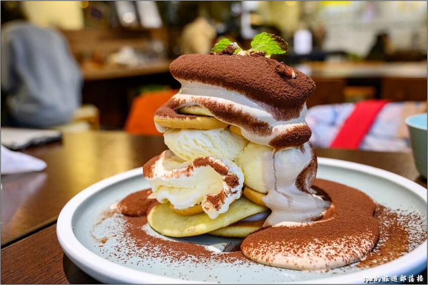 這道「提拉米蘇麻糬鬆餅」是Labu的人氣甜點。特殊的麻糬鬆餅搭上一整層超厚實的冰淇淋,以及中間超對味的孔雀餅乾,最後淋上滿滿的提拉米蘇與可可粉,是還到Labu下午茶時不可錯過的一道甜點。上面點綴了兩片薄荷,有點像是之前哪個漫畫中怪獸的造型,端上桌就是道好吃又好拍的餐點!
