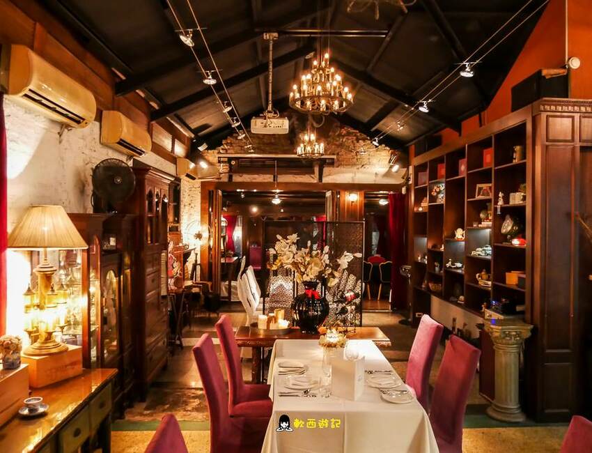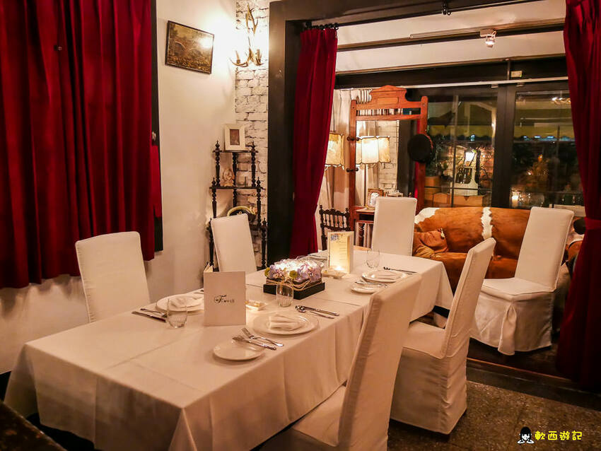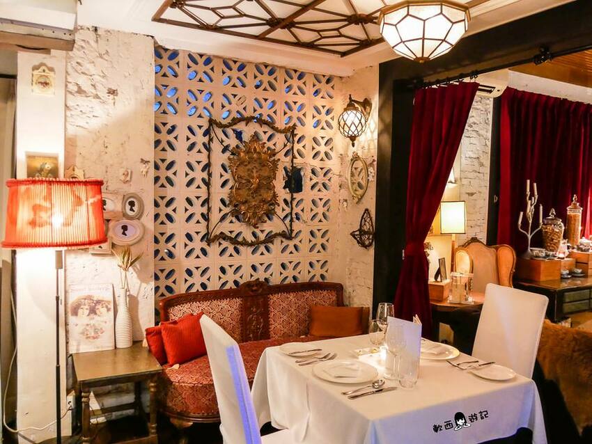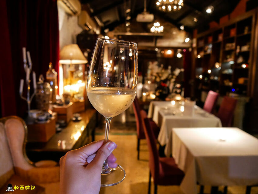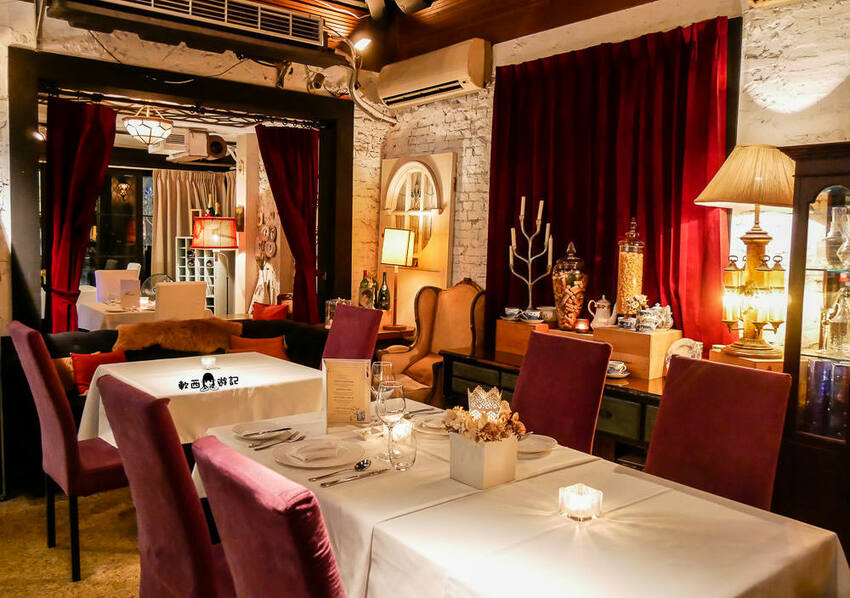 桂香挑高天花板、延伸寬敞的長桌空間,昏黃有氣氛環境和貴氣古典紫色絨布椅,加上兩旁豐富的藏酒和古典收藏擺飾,彷彿方才的大門隔絕的不只是台北街頭和私人宅邸,還隔絕了時間與空間,讓來用餐的人客,像是掉入了某個中世紀皇室君王的城堡宮殿,抑或是某個貴族的豪宅宅邸。