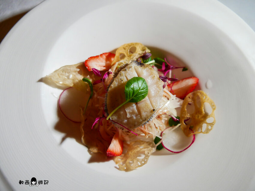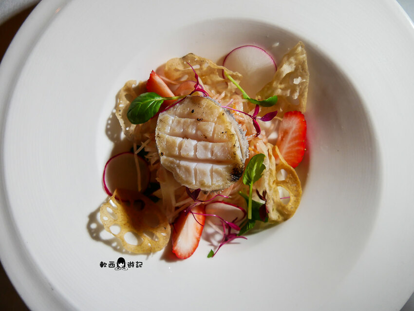 一看到上桌有草莓就眼睛一亮的草莓控軟西,主廚表示每個月都要換菜單,必須絞盡腦汁研發新菜色,依季節調整蔬果入菜,這次的草莓跟炸蓮藕就是廚師的小創意。