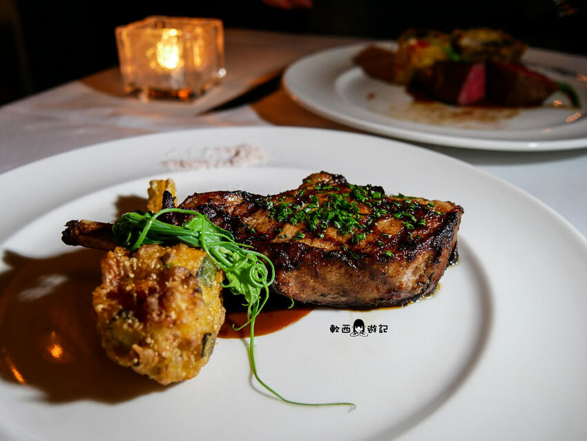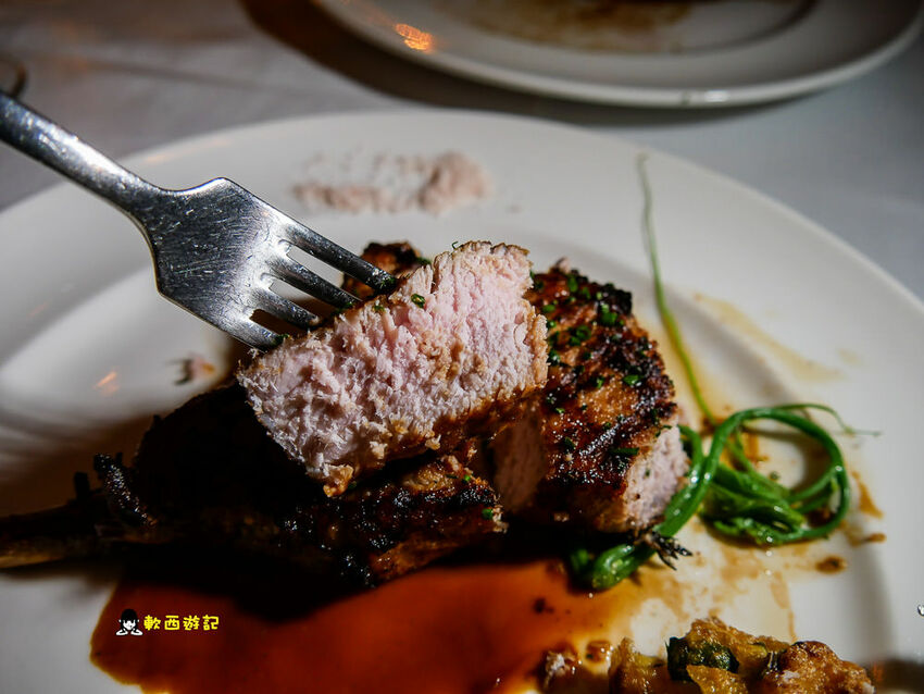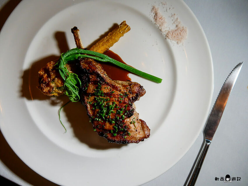 一旁搭配的是克什米爾玫瑰鹽,豬肉帶點淡淡奶香和榛果香氣,不過吃到中間肉質部分稍微有點偏乾,搭配著底下紅酒醬汁比較對味。