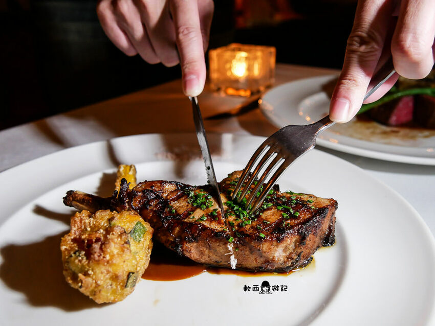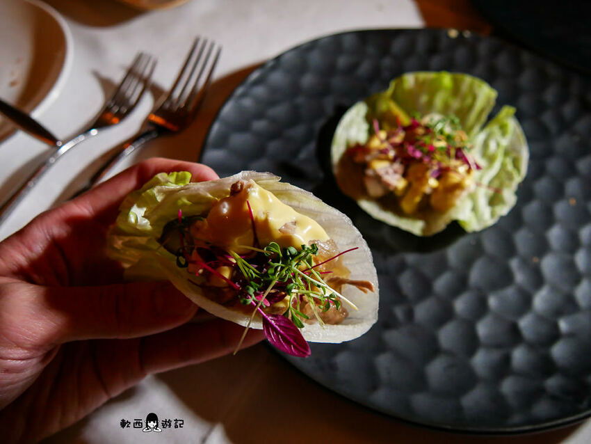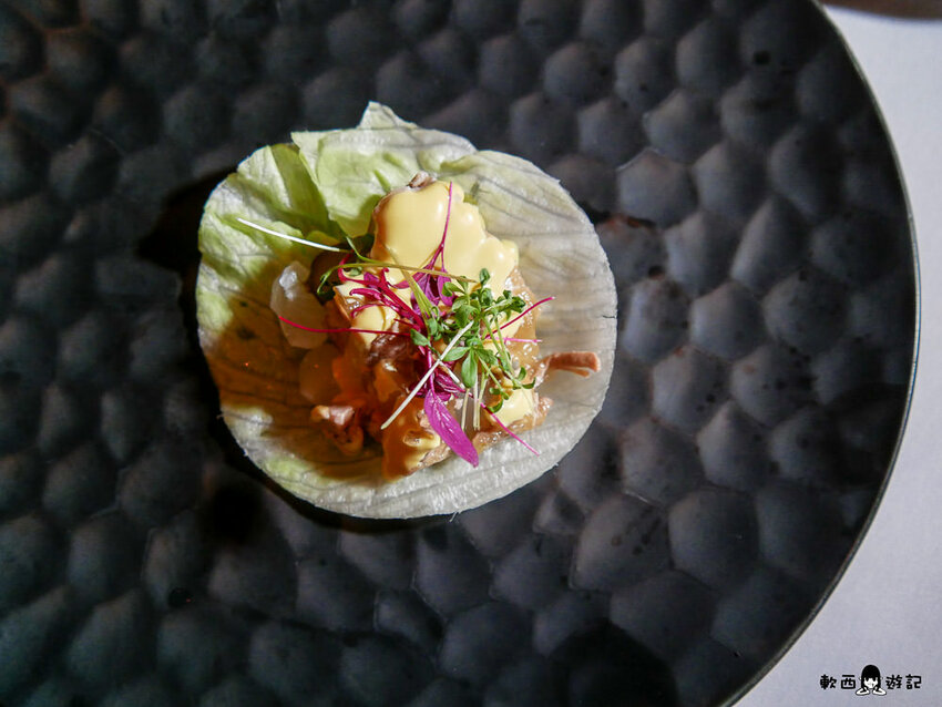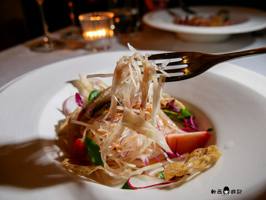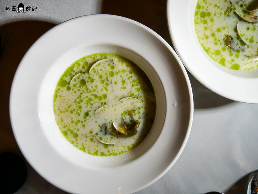 一入口先吃到黃芥末的嗆,再來感受到豬腳凍的冰、嫩、潤,其實滿像完整高級無骨的雞爪凍,咕溜一下就頑皮地滑進嘴裡,小洋蔥逼逼啵啵增添層次,喝一口白酒緩解芥末嗆又可以圓潤這道菜,不過柯軟覺得黃芥末偏多稍微有點搶戲,詢問服務生之後才知道之前有人反應醬不夠,主廚才加量的XD只能說每個人感受都大不相同阿。