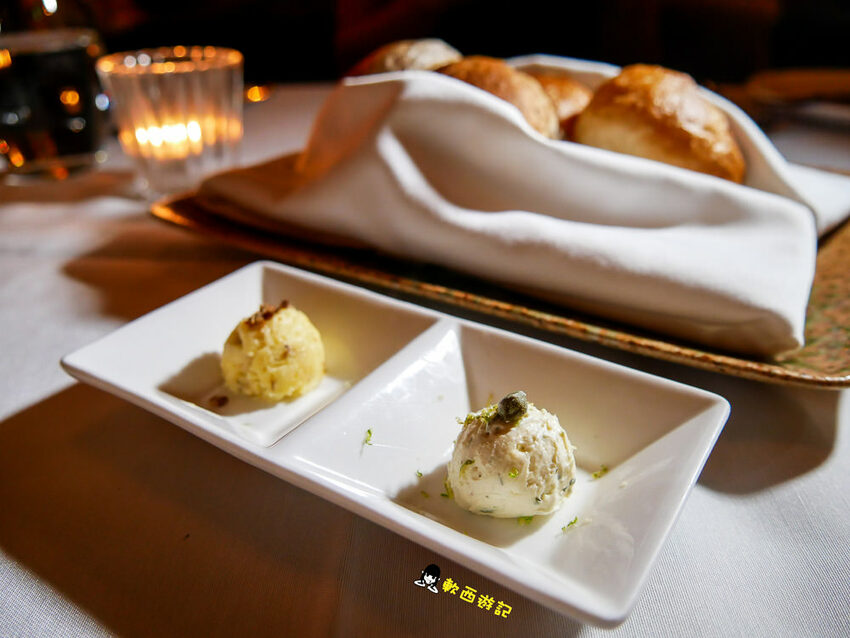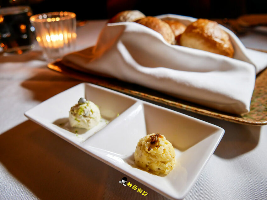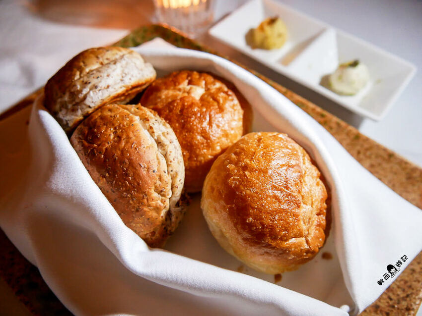 麵包有兩款,一款是酥脆圓麵包,另一款是核桃雜糧健康麵包,圓麵包外皮烤得相當酥脆,咬下去還可以聽到卡滋卡滋的聲音,熱騰騰蓬鬆軟麵包內裡加上甜味桂花醬,花香甜因熱融化慢慢在口中散開,滑順香氣柯軟都相當喜歡,雖然好吃到很想再續一份,但低頭看了看杜子一圈肥油還是作罷,把胃留給等等的主餐吧。