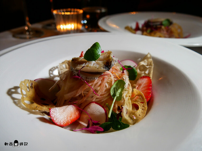 不過覺得比較可惜是草莓獨立分開的感覺,草莓是草莓,豆薯是豆薯,鮑魚是鮑魚,分開都美味但搭在一起沒有加分或減分,最柯軟印象最深刻的居然是炸蓮藕!相當薄脆,甜甜的藕香像糖粉一樣在嘴裡化開。