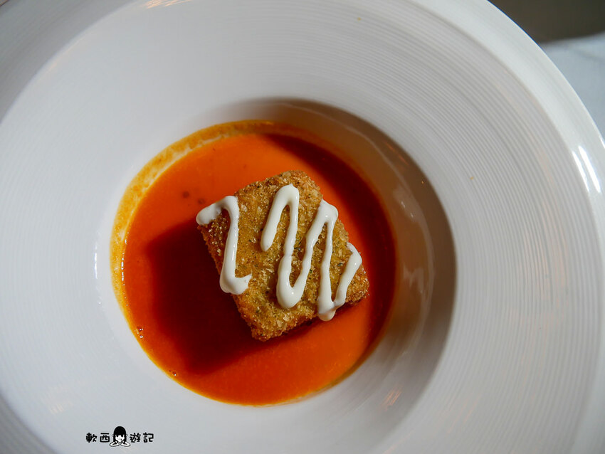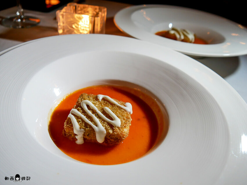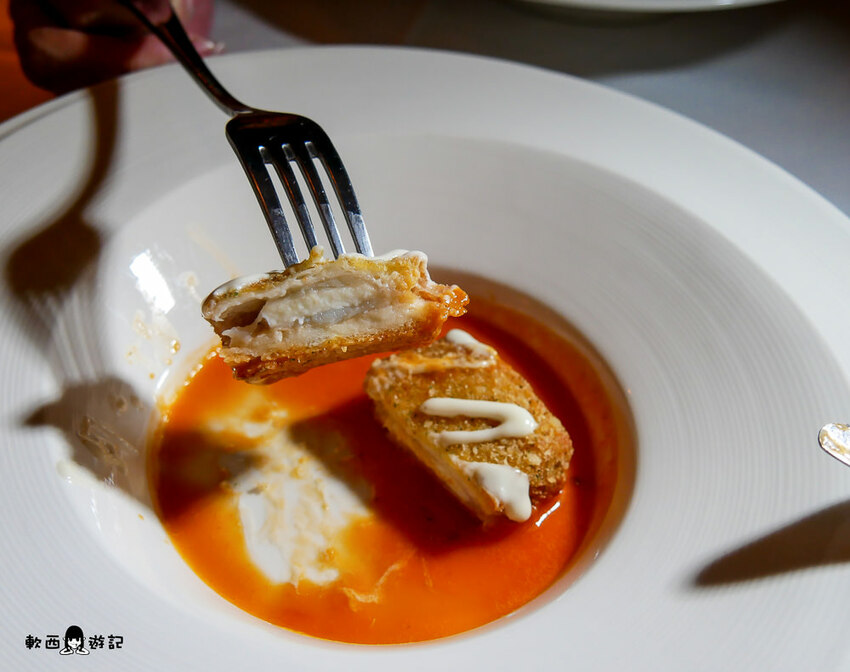 乍看之下以為是個炸物小玩意兒,沒想到一吃下去著實讓柯軟瞪大了眼,微微酸甜番茄醬提味,裡頭龍蝦漿Q彈厚實爽口,和起司譜出完美融合三重奏。