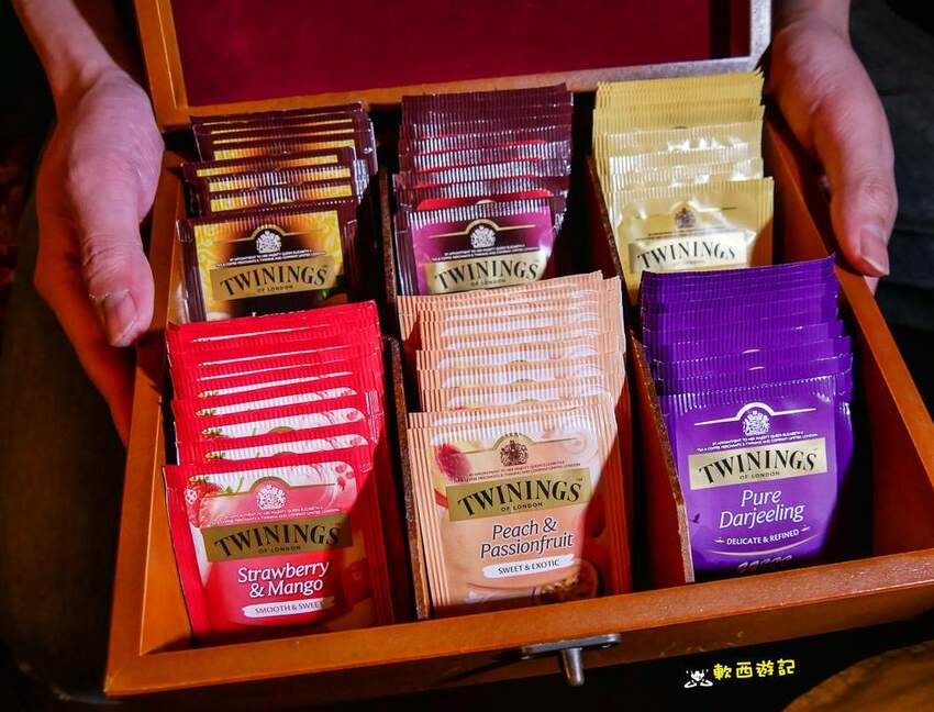 最後吃飽喝足到了甜點時間,直接大氣拿TWININGS來給人客挑,前面兩款果香草莓芒果和百香果是沒有咖啡因的,後面四款以紅茶為基底。