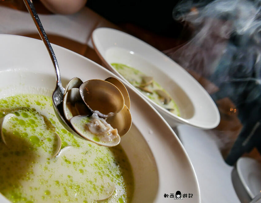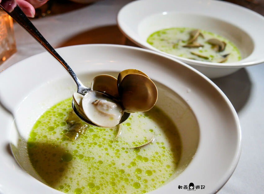 才舀起就聞到蛤蜊濃濃鮮味,溫和蒜香在口鼻中濃郁縈繞,蛤蜊肥鮮回甘後勁十足,咬著咬著還有昆布提升嚼勁。
