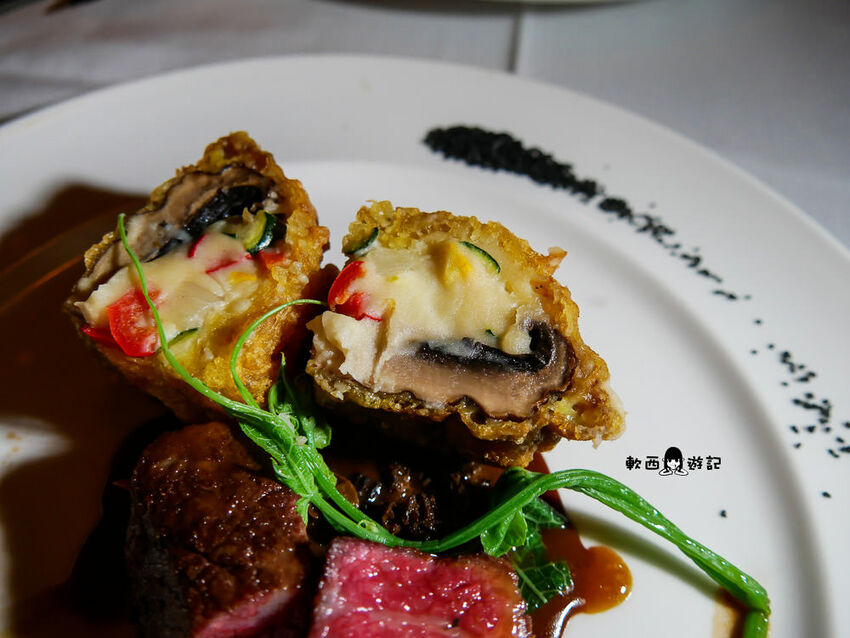 一旁的配菜把香菇、櫛瓜、甜椒等包成一個菜包,裡頭還有馬鈴薯泥柔軟細膩,蔬菜多水飽滿但絲毫不影響外頭的脆度。