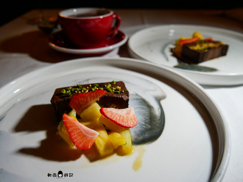 與其說是蛋糕,倒比較像是巧克力慕斯的感覺,一切下去整個超!濃!苦甜巧克力絲絲入扣緊抓著味蕾,喝一口茶稍緩濃郁甜味,水果酸甜清爽中和甜膩。